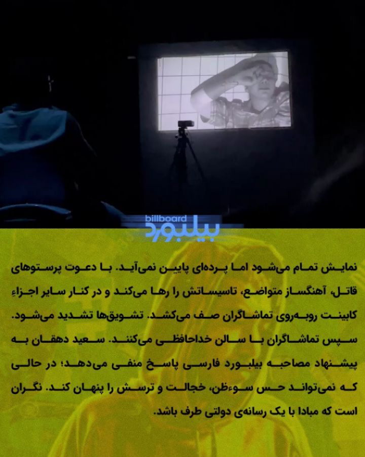 نمایش تمام میشود اما پردهای پایین نمیآید. با دعوت پرستوهای قاتل، آهنگساز متواضع، تاسیساتش را رها میکند و در کنار سایر اجزاءِ کابینت روبهروی تماشاگران صف میکشد. تشویقها تشدید میشود. سپس تماشاگران با سالن خداحافظی میکنند. سعید دهقان به پیشنهاد مصاحبه بیلبورد فارسی پاسخ منفی میدهد؛ در حالی که نمیتواند حس سوءظن، خجالت و ترسش را پنهان کند. نگران است که مبادا با یک رسانهی دولتی طرف باشد.