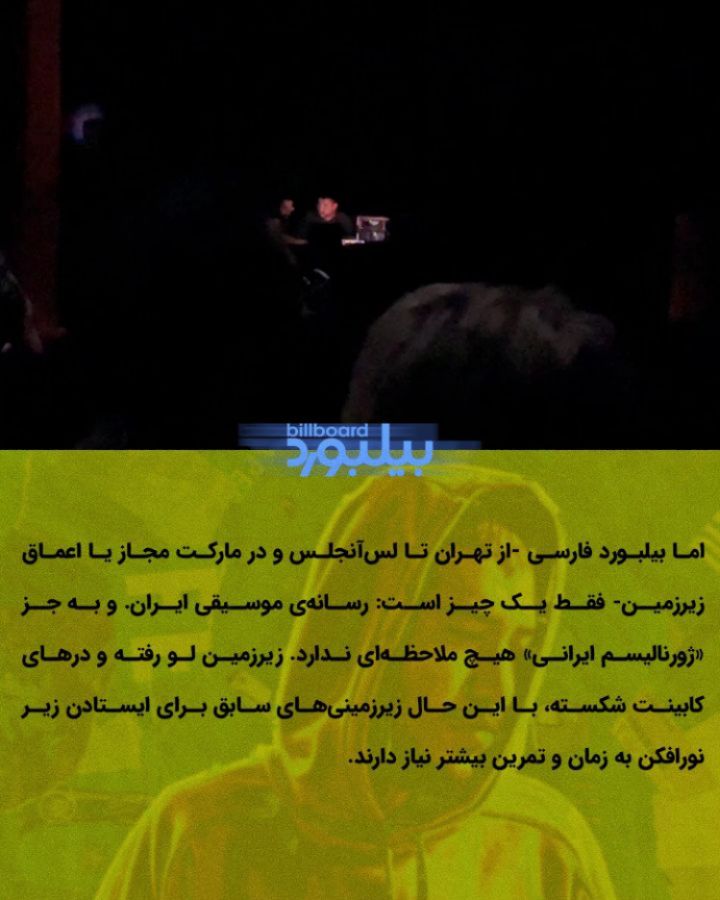 اما بیلبورد فارسی -از تهران تا لسآنجلس و در مارکت مجاز یا اعماق زیرزمین- فقط یک چیز است: رسانهی موسیقی ایران. و به جز «ژورنالیسم ایرانی» هیچ ملاحظهای ندارد. زیرزمین لو رفته و درهای کابینت شکسته، با این حال زیرزمینیهای سابق برای ایستادن زیر نورافکن به زمان و تمرین بیشتر نیاز دارند.