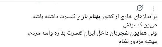 کاربر دیگری هم نوشت: «براندازهای خارج از کشور بهنام بانی کنسرت داشته باشد به کنسرتش میروند ولی همایون شجریان داخل ایران برای مردم کنسرت بگذارد، میشود مزدور نظام.»