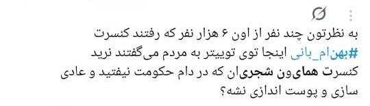 کاربر دیگری نیز این سوال را مطرح کرد که: «به نطرتان چند نفر از آن شش هزار نفری که به کنسرت بهنام بانی رفتند اینجا در توئیتر به مردم میگفتند به کنسرت همایون شجریان نروید تا در دام حکومت نیفتید و عادیسازی نشود؟»